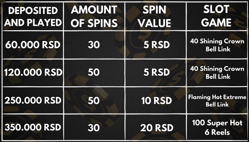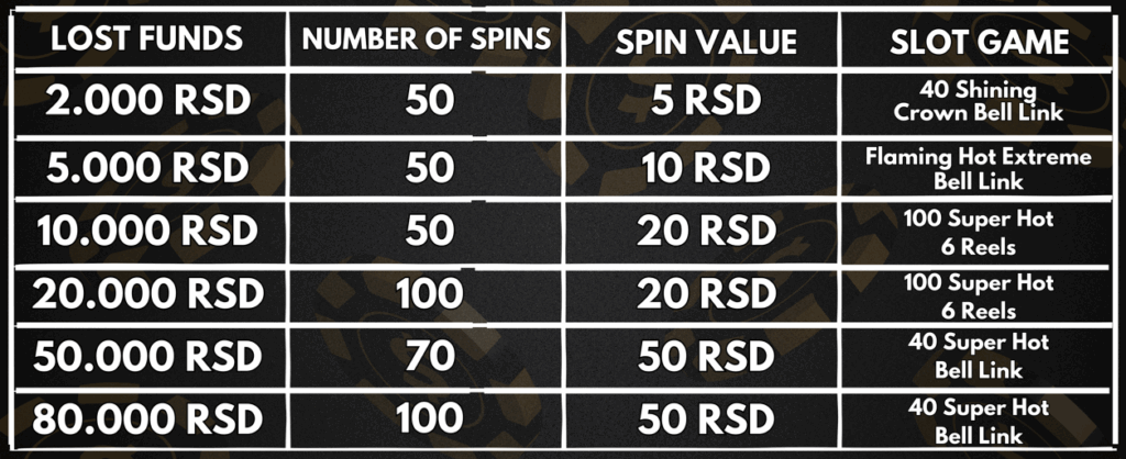 That’s not all, if you weren’t lucky, you can also receive spins based on the amount of lost funds, according to the following table: